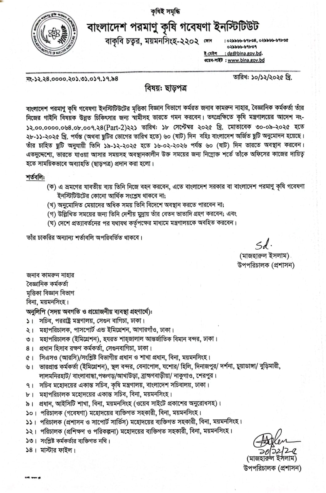 | ৪ | ছাড়পত্র (জনাব কামরুন নাহার, বৈজ্ঞানিক কর্মকর্তা) | ১৫-১২-২০২৫ | দেখুন | ||